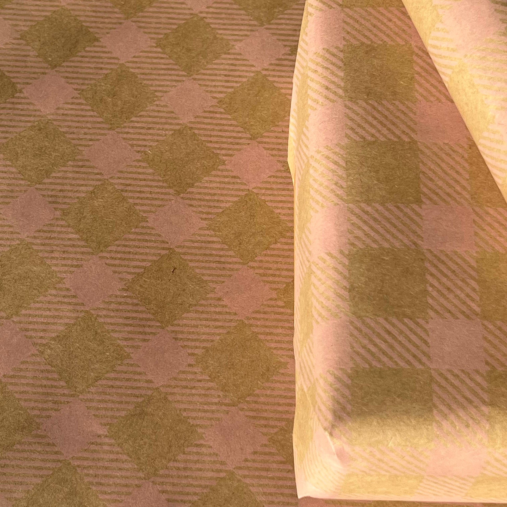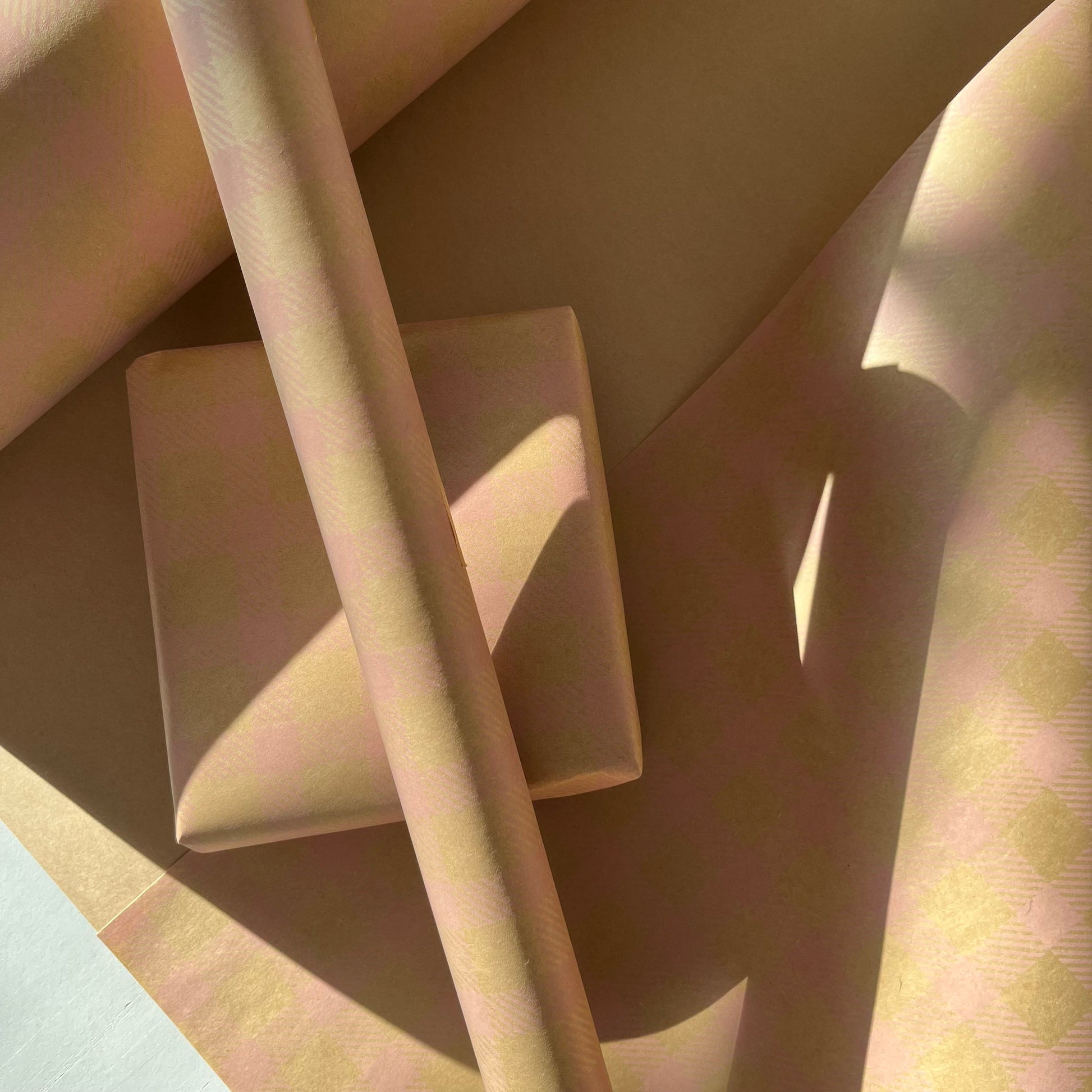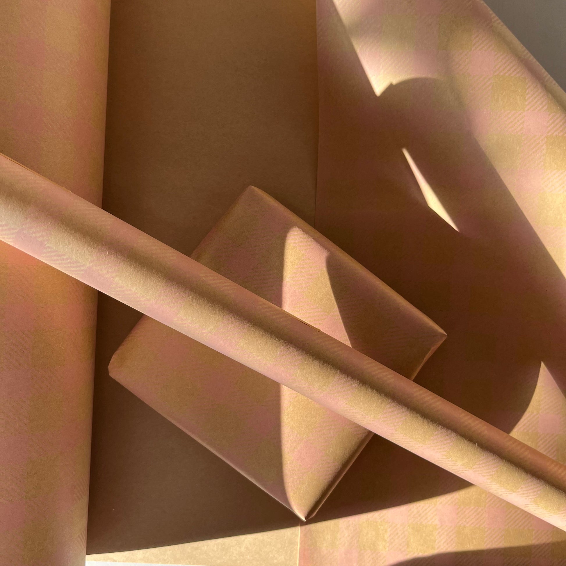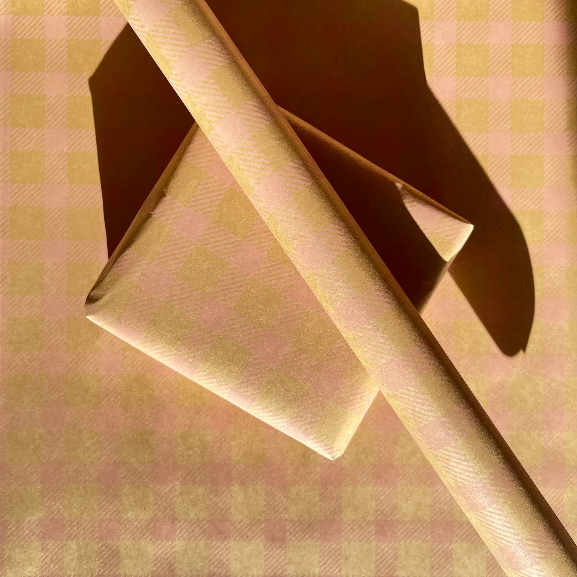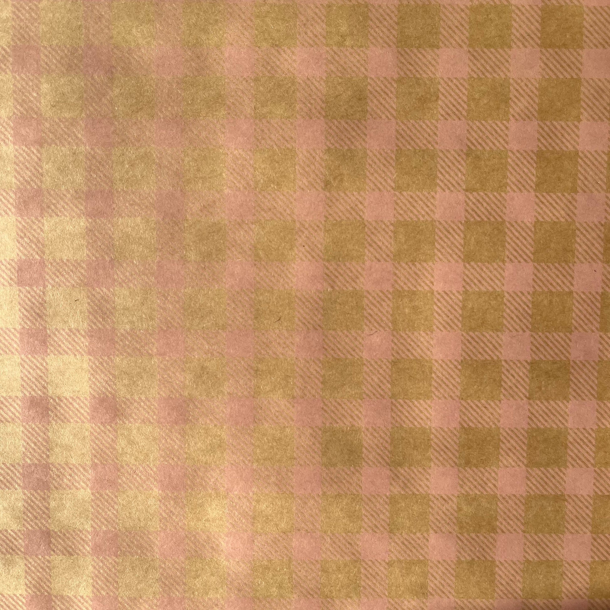 Our Pink Gingham Check Kraft gift wrap is made of brown, ribbed 50 gsm kraft paper and printed with a Pink Gingham Check on one side using Eco friendly, water based inks.