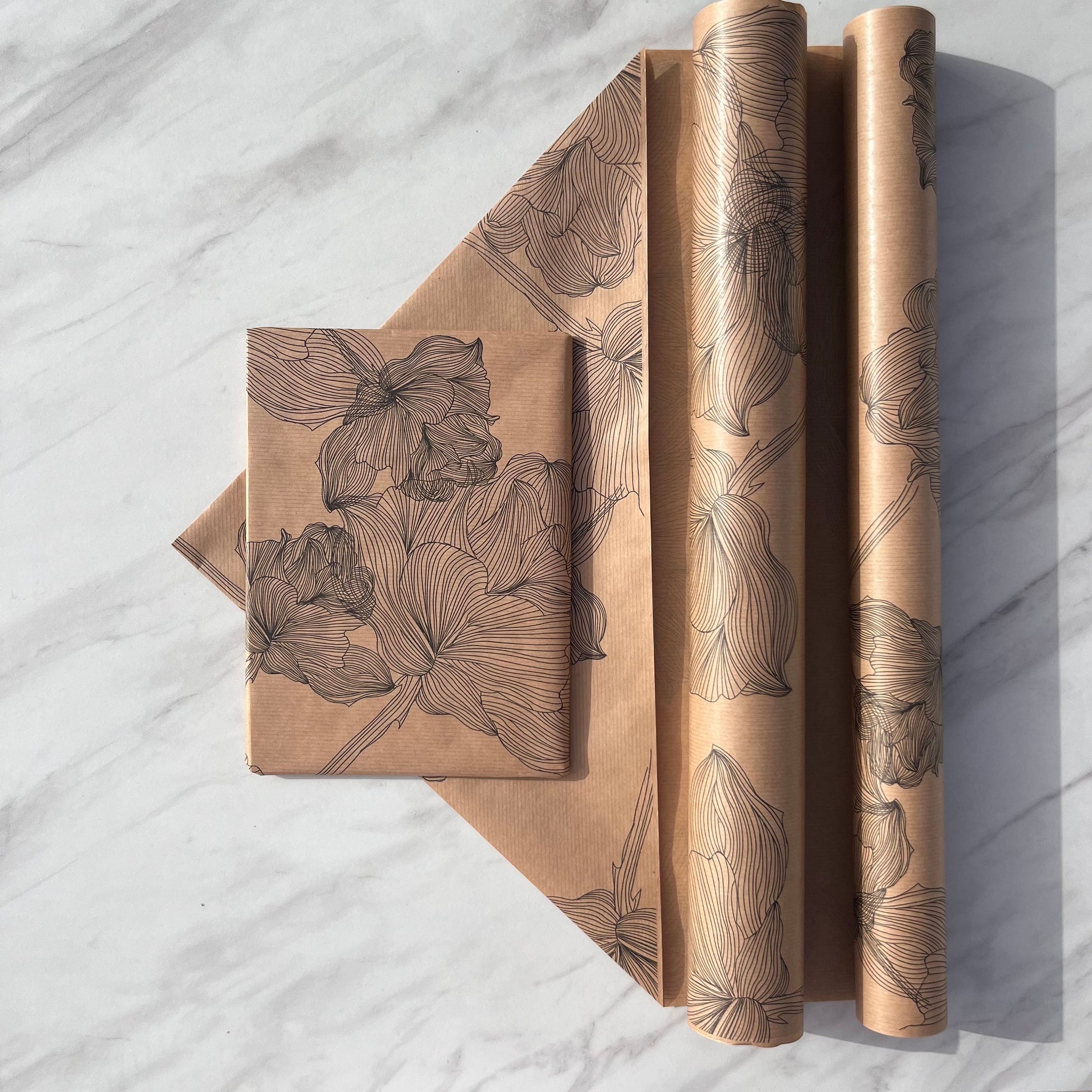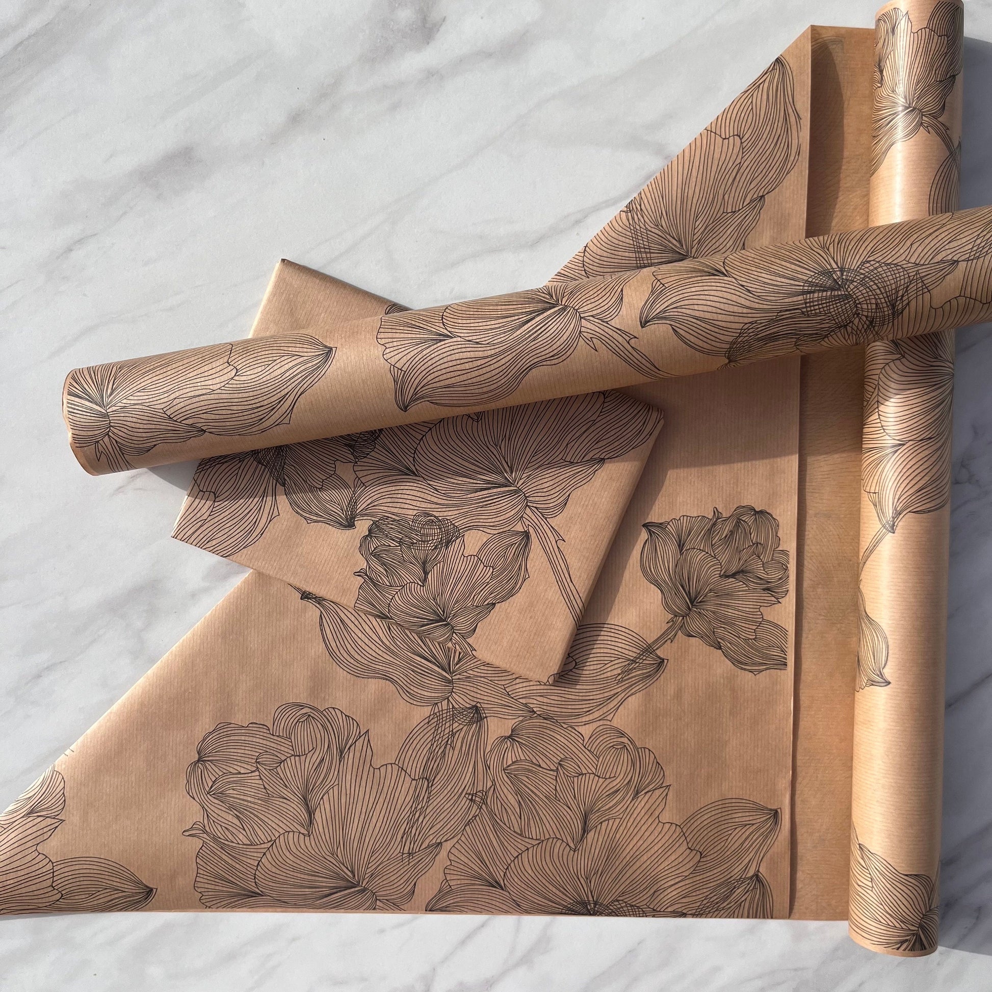 Our Black Floral Kraft gift wrap is made of brown, ribbed 50 gsm kraft paper and printed with a Black Floral print on one side using Eco friendly, water based inks.