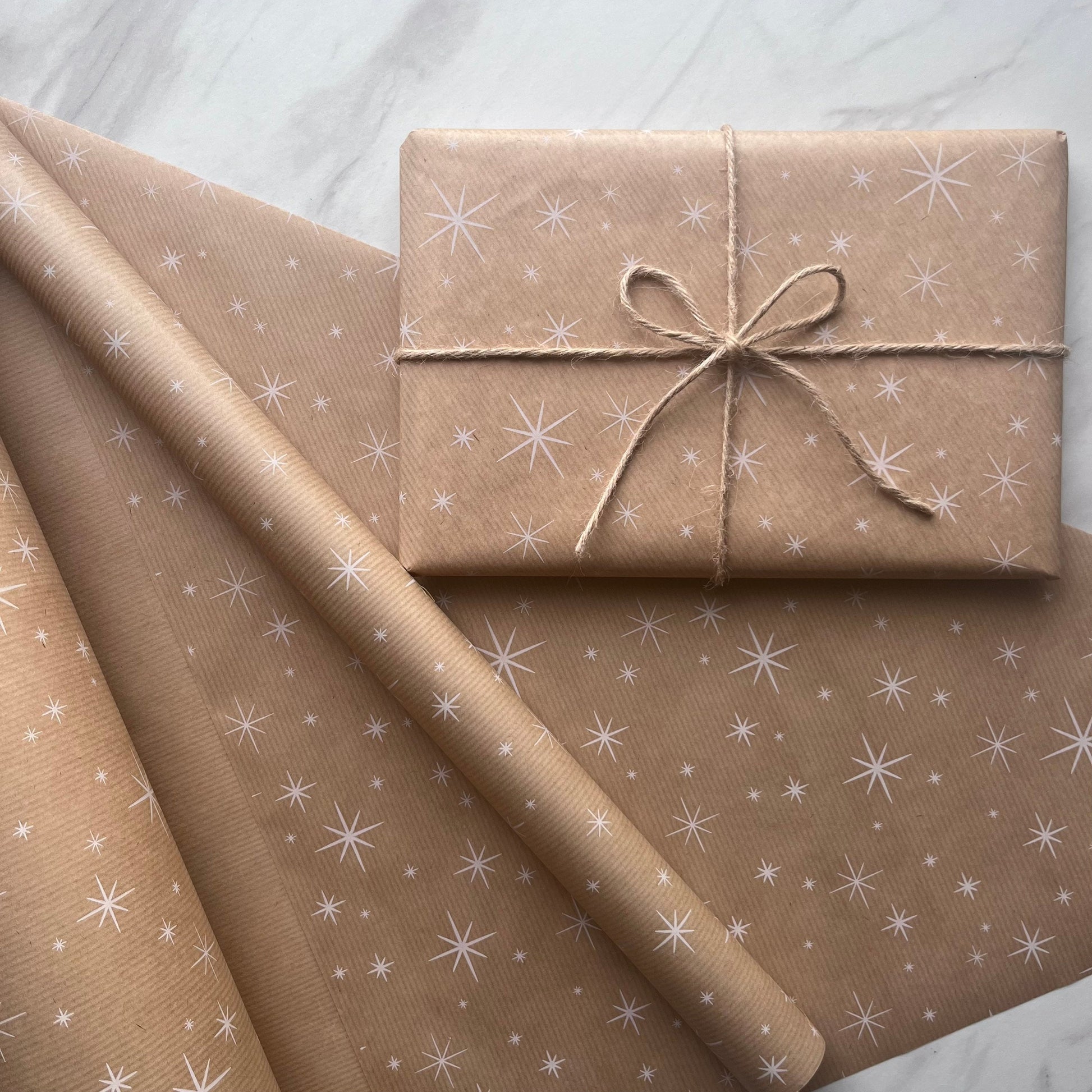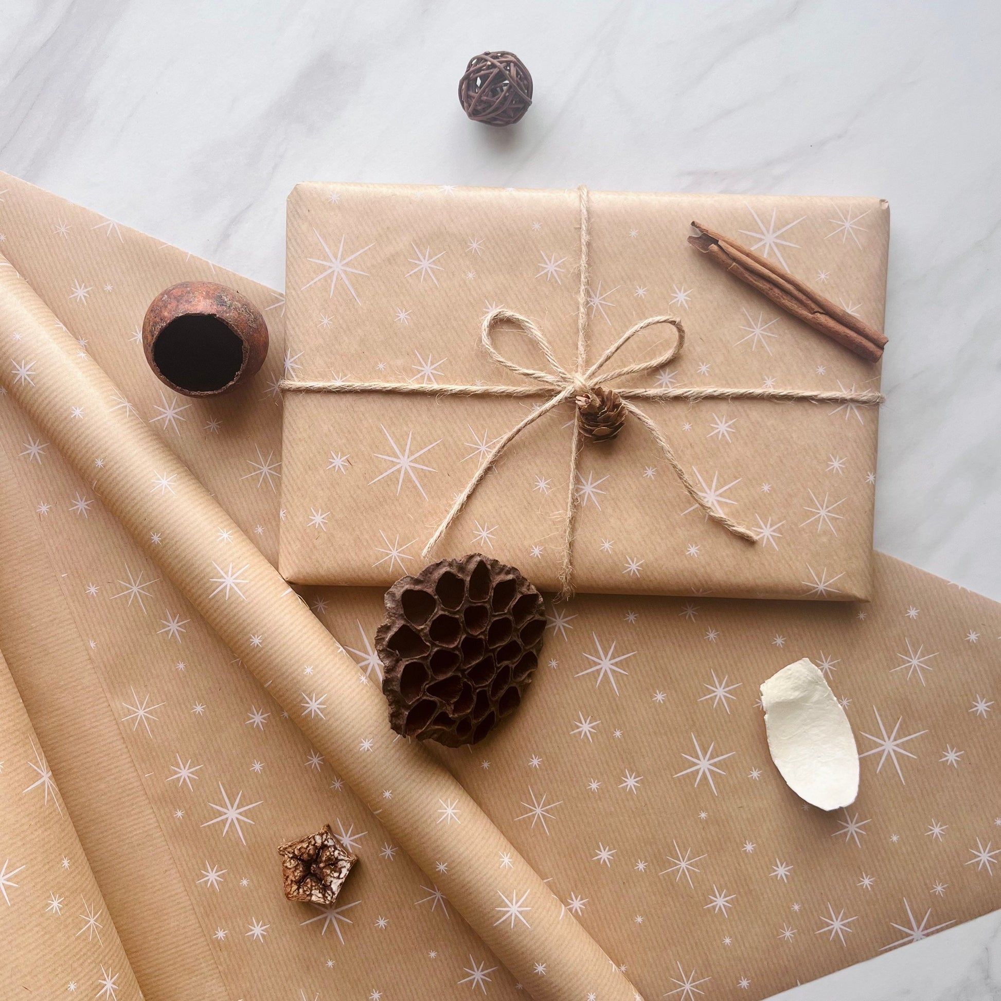 Our Christmas White Sparkle Kraft gift wrap is made of brown, ribbed 50 gsm kraft paper and printed with Christmas White Sparkle using eco‑friendly, water‑based inks.