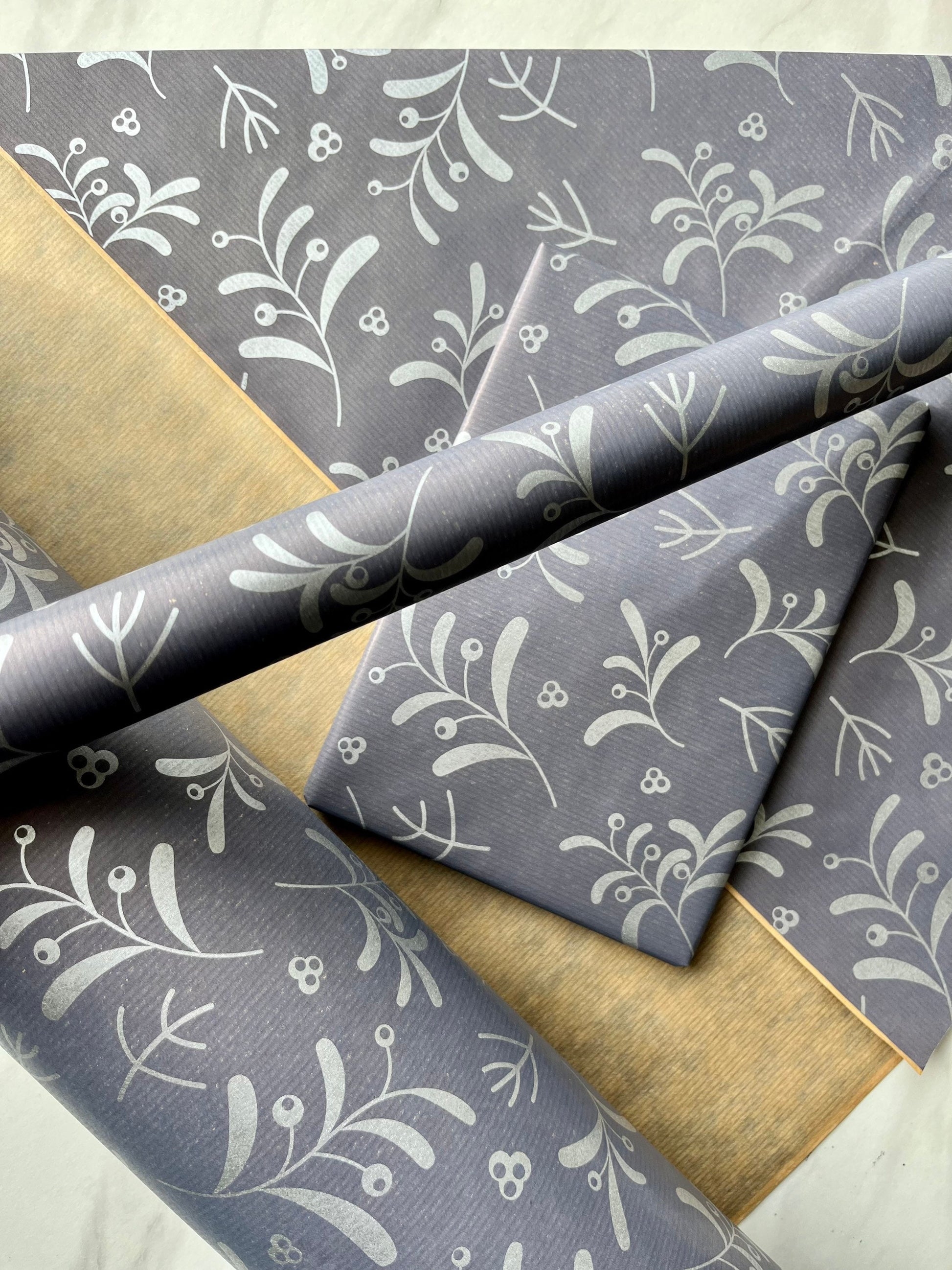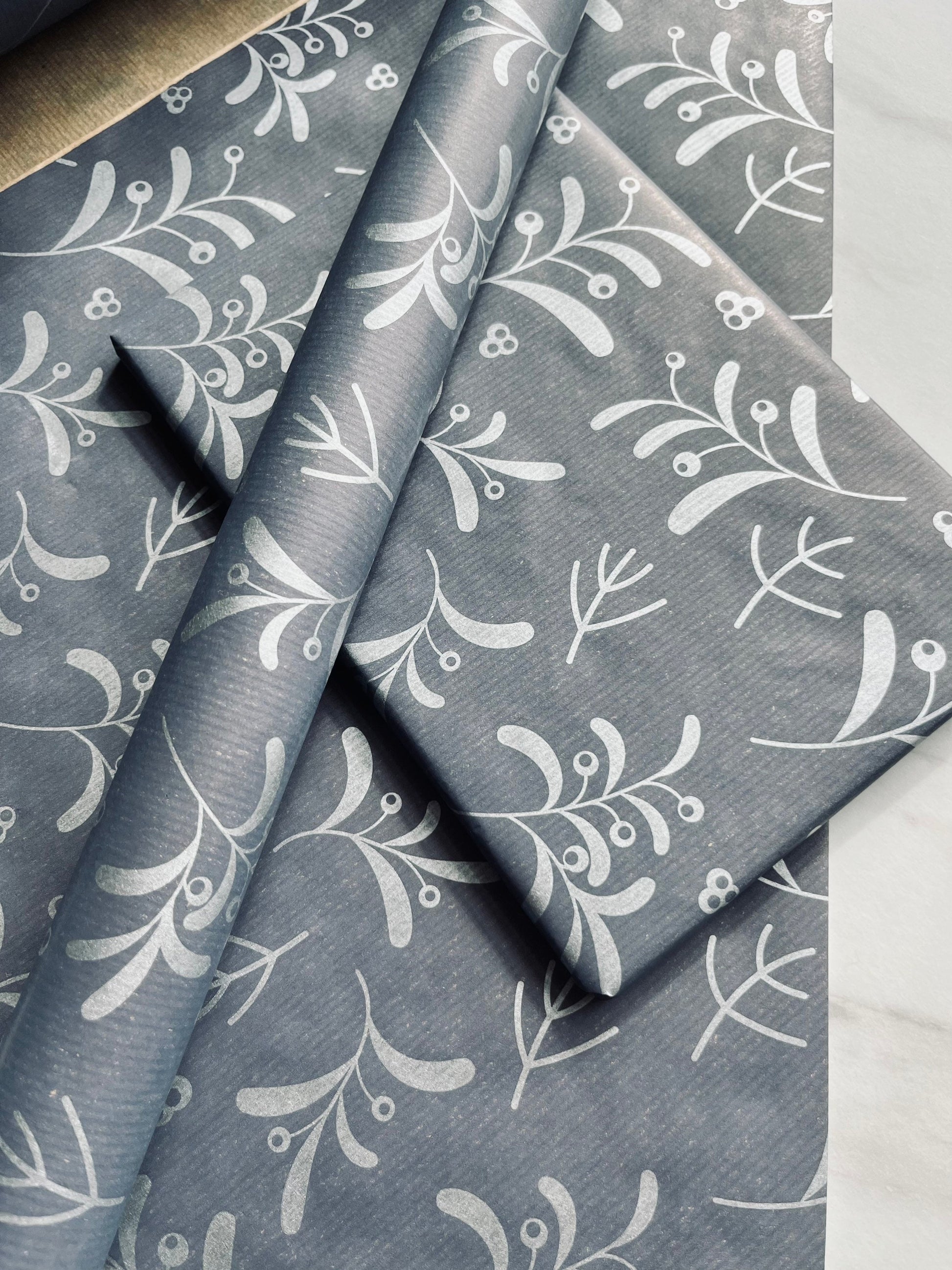 Our Navy Blue Mistletoe Kraft gift wrap is made of brown, ribbed 50 gsm kraft paper and printed Navy Blue with Silver Mistletoe on one side using Eco friendly, water based inks.