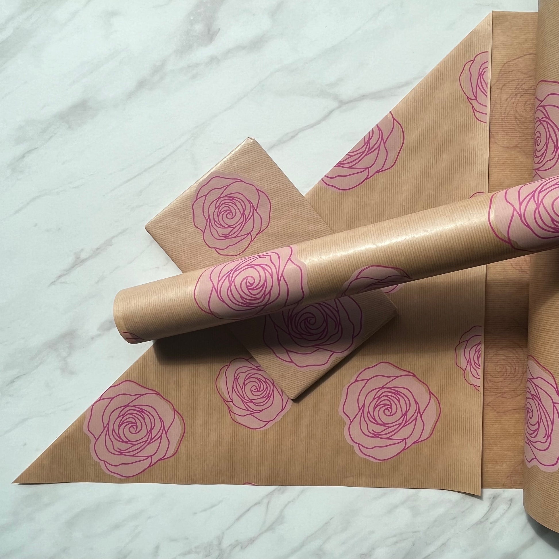 Our Pink Roses Kraft gift wrap is made of brown, ribbed 50 gsm kraft paper and printed with a Pink Roses print on one side using Eco friendly, water based inks.