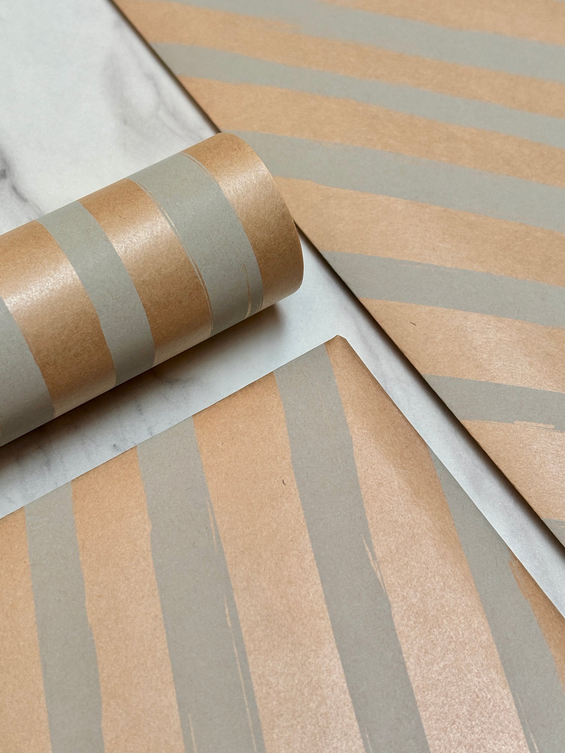 Our Blue Painted Stripes Kraft gift wrap is made of brown, ribbed 50 gsm kraft paper and printed with a painted light blue stripe design on one side using Eco friendly, water based inks.